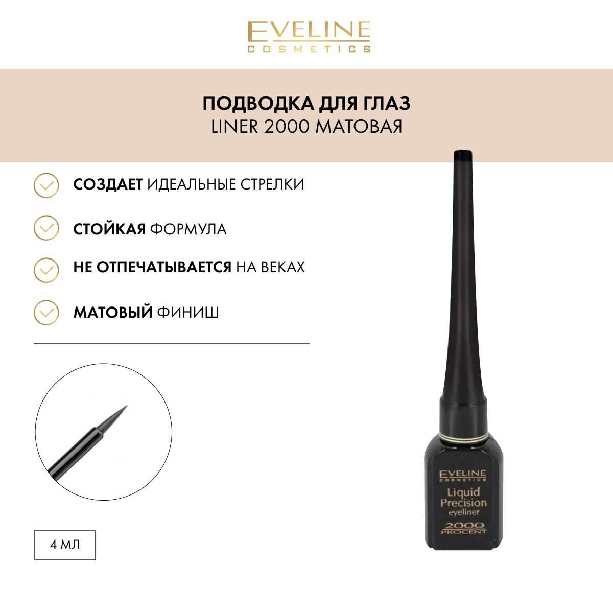 Подводка для глаз Eveline Cosmetics, LIQUID PRECISION eyeliner 2000 PROCENT, матирующая, черная, 4 мл