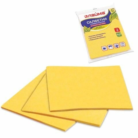Салфетки универсальные, 30х38 см, комплект 3 шт., 90 г/м2, вискоза (ИПП), желтые, LAIMA, 601560 (цена за 1 ед.товара)