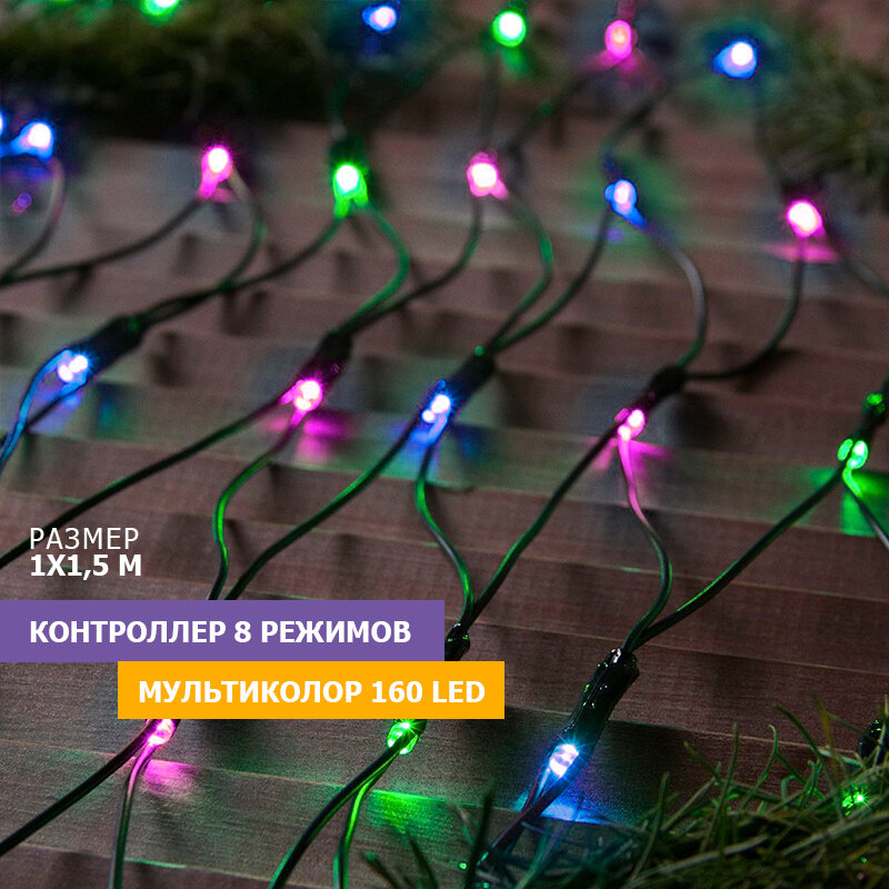 Светодиодная гирлянда Neon-night "Сеть" 1х1.5 м, 8 режимов, 160 разноцветных светодиодов, черный провод 3 100 ₽