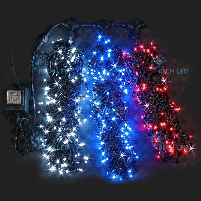Свет Rich LED Гирлянда светодиодная триколор 8 режимов свечения 24B, 600 LED, провод черный, IP54 RL-T3*20N2-B/WBR