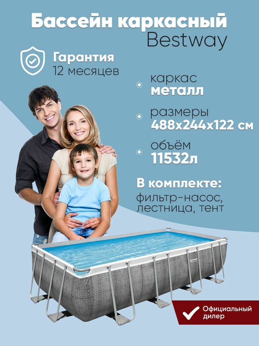 Бассейн каркасный Bestway, 488х244х122 см, Power Steel Rectangular, 56996BW, фильтр-насос, лестница, тент, 11532 л