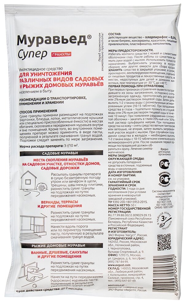 От муравьев Муравьед Супер 50гр. (хлорпирифос) Август
