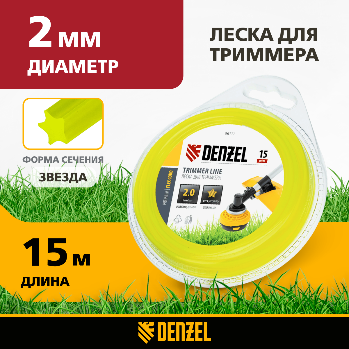Леска для триммера звезда 2 мм х 15 м DENZEL 96111