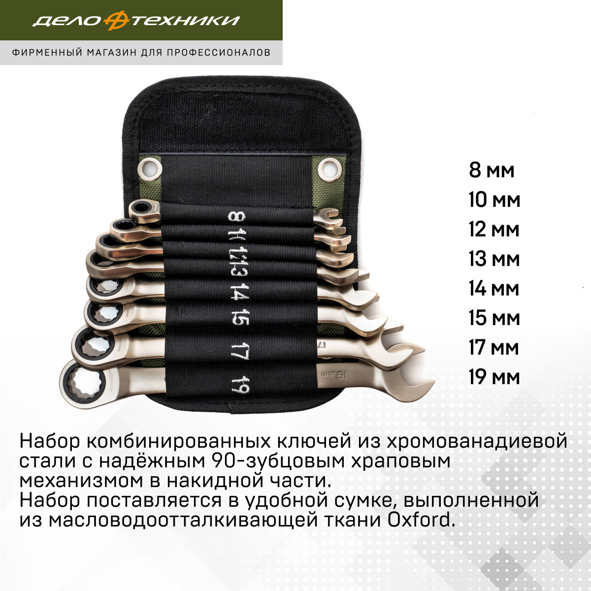 Дело техники 515085 Набор ключей трещоточных комбинированных 8 шт (8 10 12 13 14 15 17 19 мм) в фирменной сумке