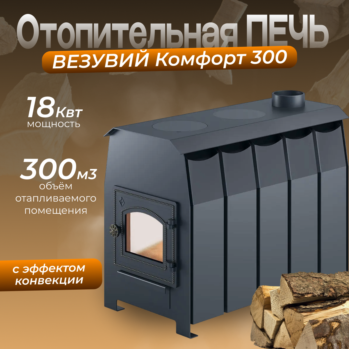 Отопительная дровяная печь Везувий "Комфорт 300" (ДТ-3C) с дверкой из чугуна со стеклом и варочной поверхностью информация: