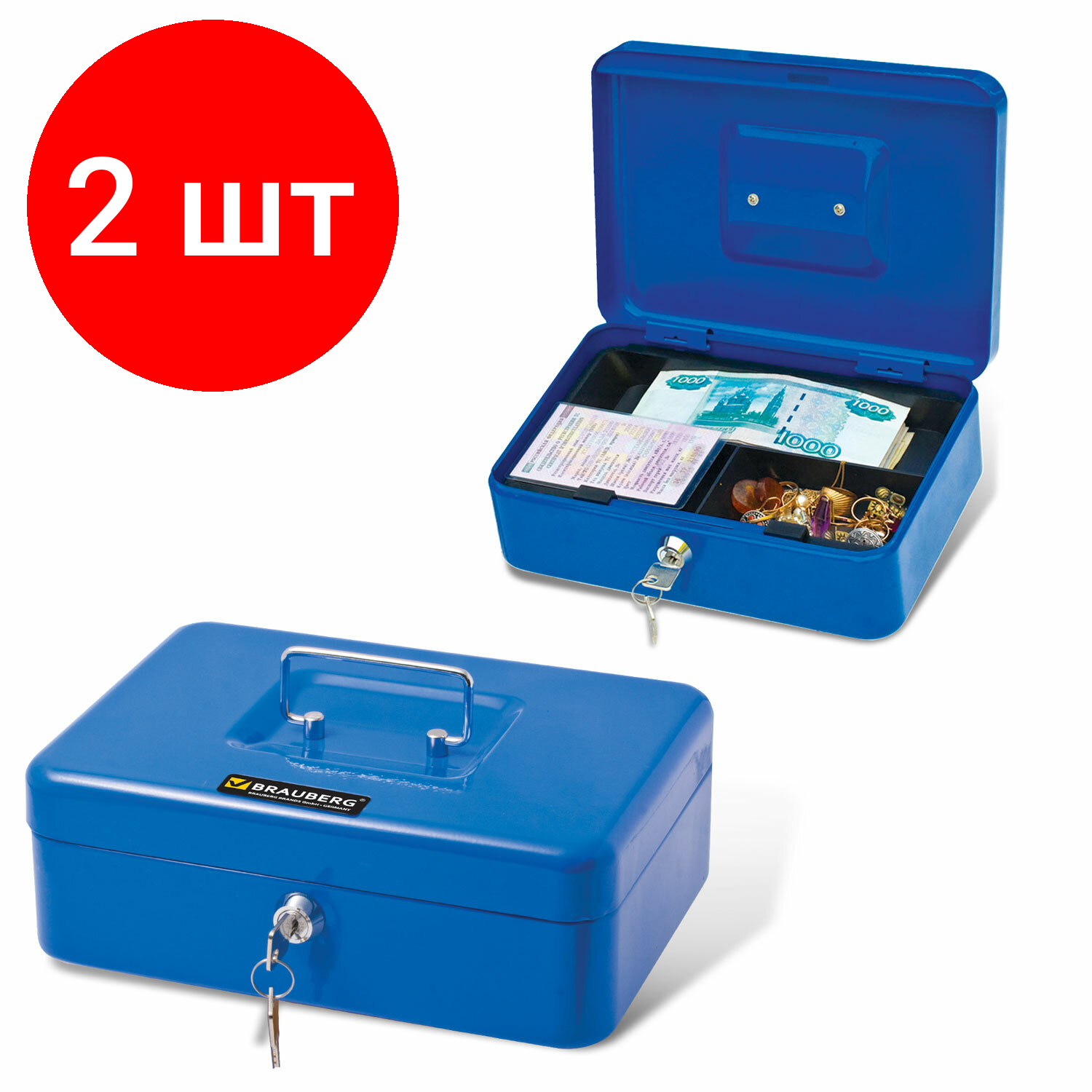 Комплект 2 шт, Ящик для денег, ценностей, документов, печатей, 90х180х250 мм, ключевой замок, синий, BRAUBERG, 290335 информация:
