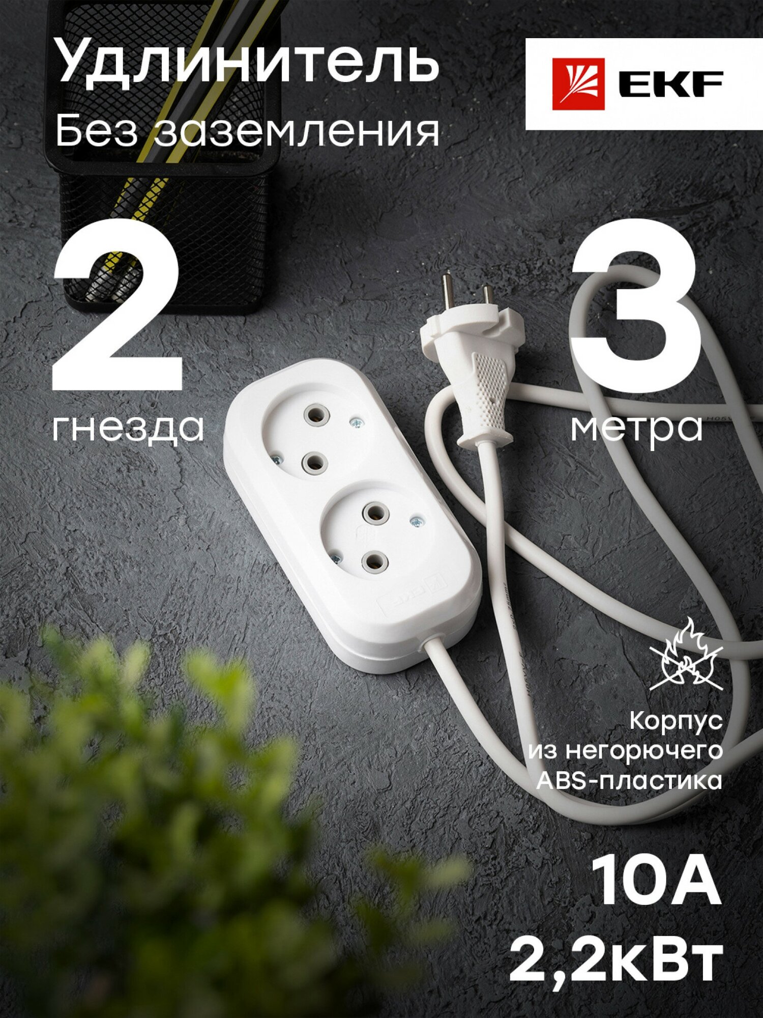 Удлинитель EKF Эксперт PROxima, 2 розетки, б/з, 10А / 2200 Вт белый 3 м