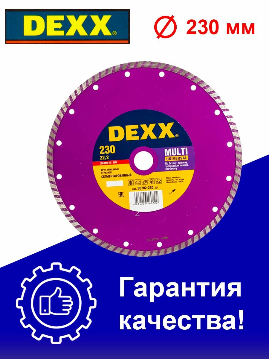 Диск алмазный DEXX MULTI UNIVERSAL 230 мм, отрезной сегментированный, бетон, кирпич, песчаник, гранит (230х22.2 мм, 7х2.5 мм) ( 36702-230_z01 ) 695 ₽