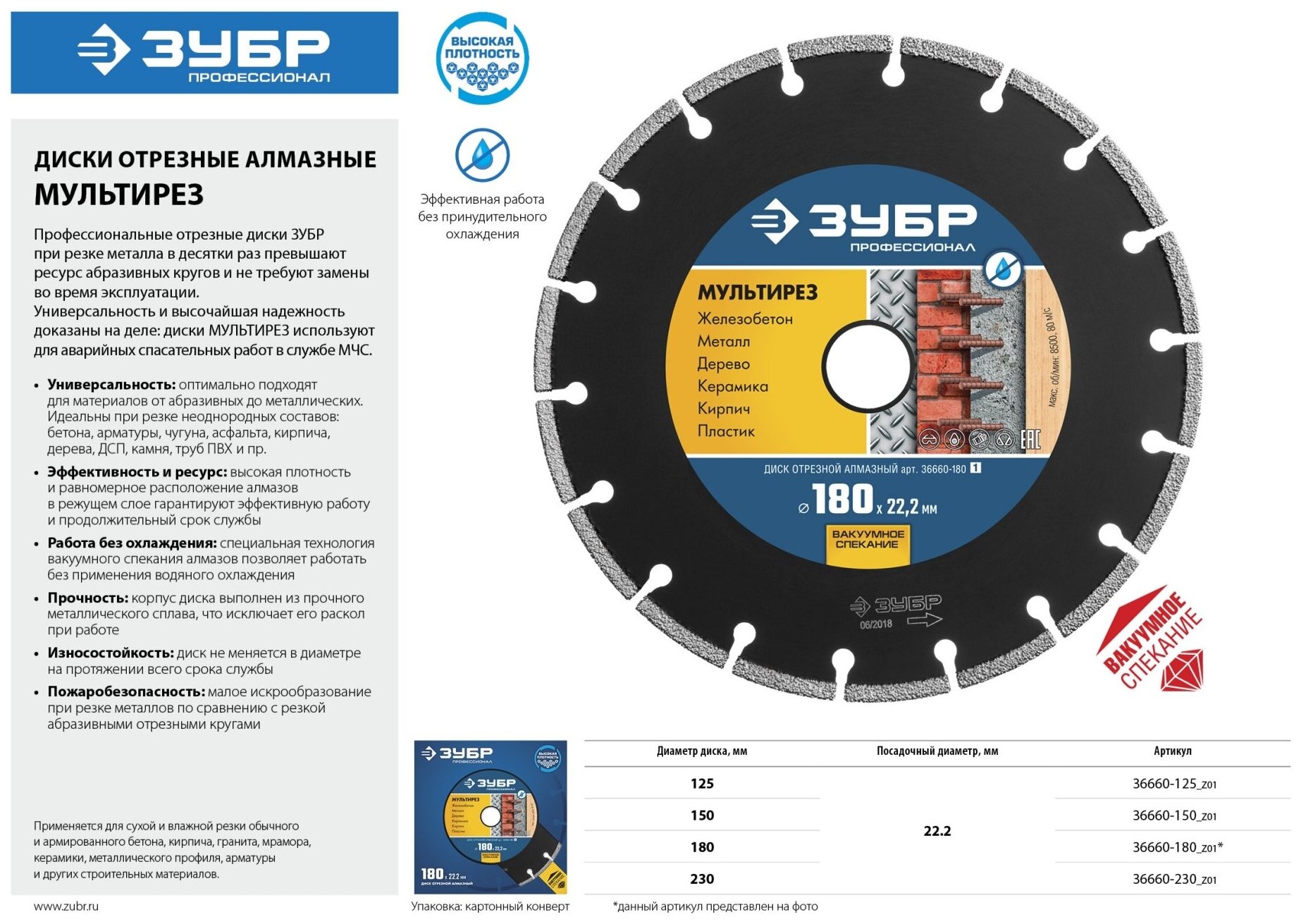 10 цен на ЗУБР мультирез 125 мм, диск алмазный отрезной универсальный (125х22.2 мм, 5х2.2 мм), 36660-125, серия Профессионал