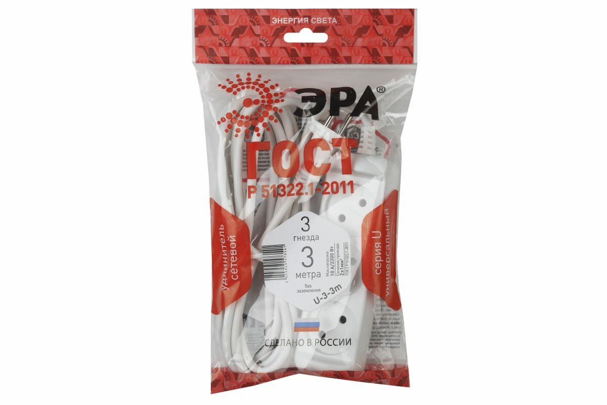 Удлинитель 3х3м без зазeмл. 10А IP20 U-3-3m ПВС 2х1 ЭРА Б0028355 (1 шт.) информация: