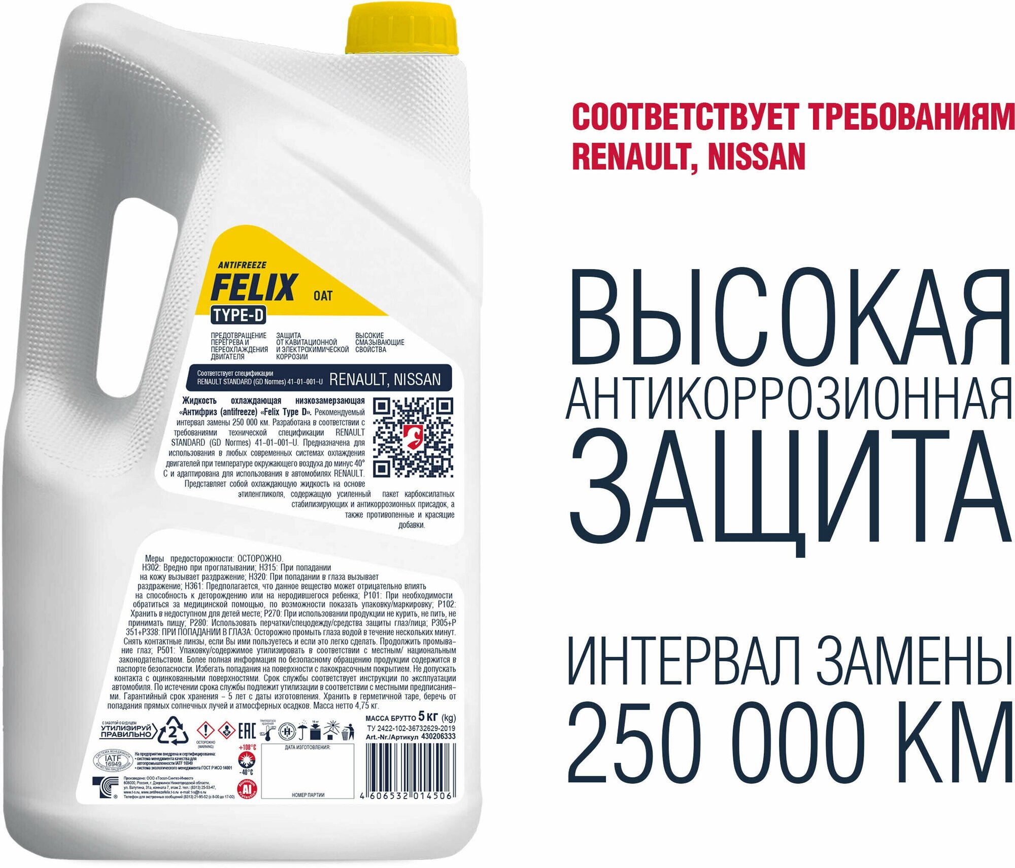 FELIX 430206333 Антифриз FELIX TYPE D желтый -40°С 5кг (PSA Renault Nissan Lada X-Ray Largus)