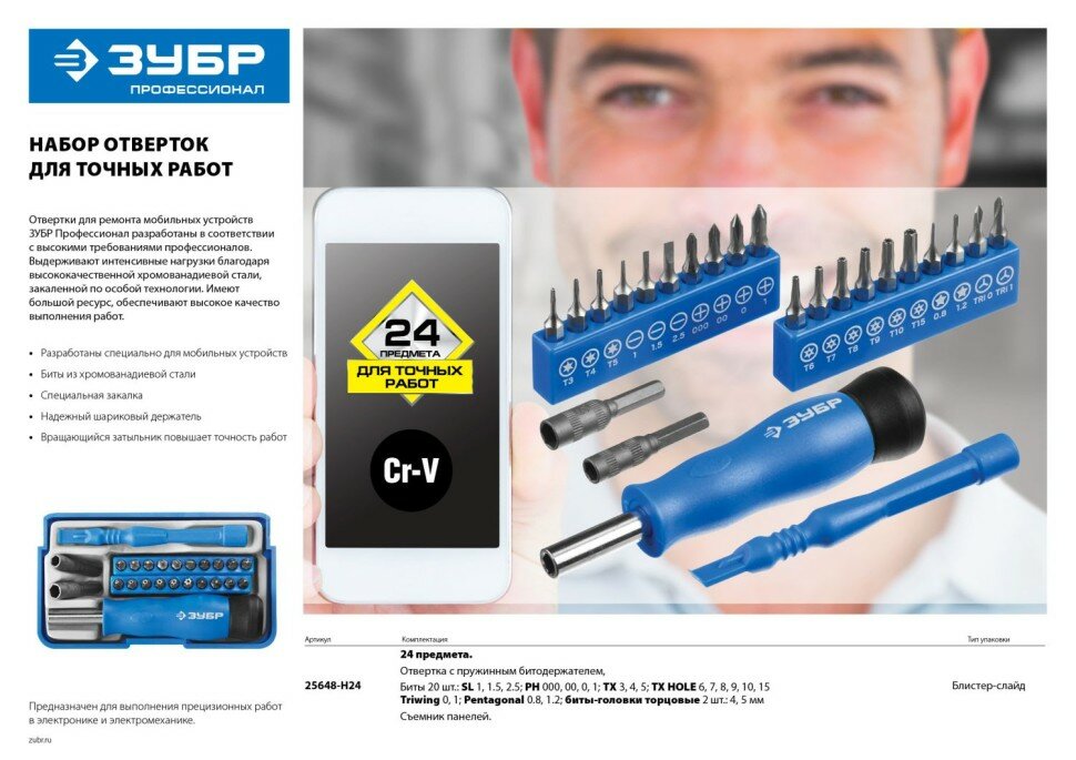 10 цен на ЗУБР 25648H24 Отвертка с битами дя точных работ и мобиьных устройств 24 прмета ЗУБР