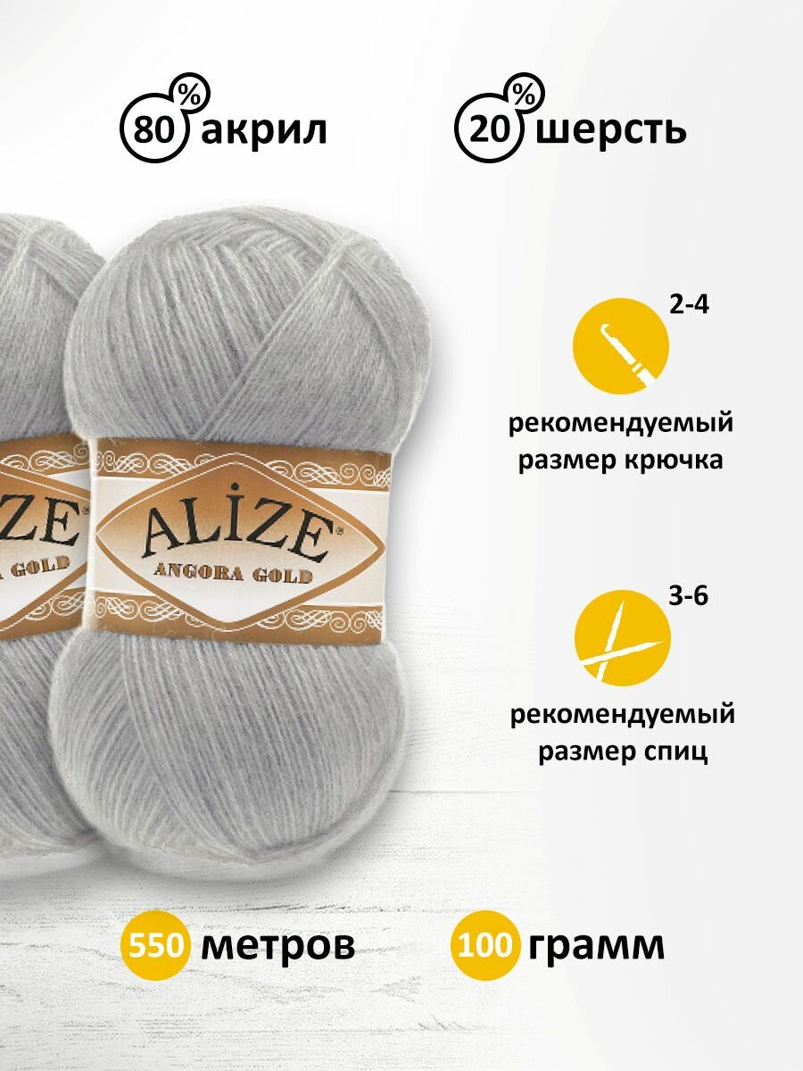 Пряжа для вязания ALIZE 'Angora Gold', 100г, 550м (80% акрил, 20% шерсть), ТУ (21 светло-серый), 5 мотков информация:
