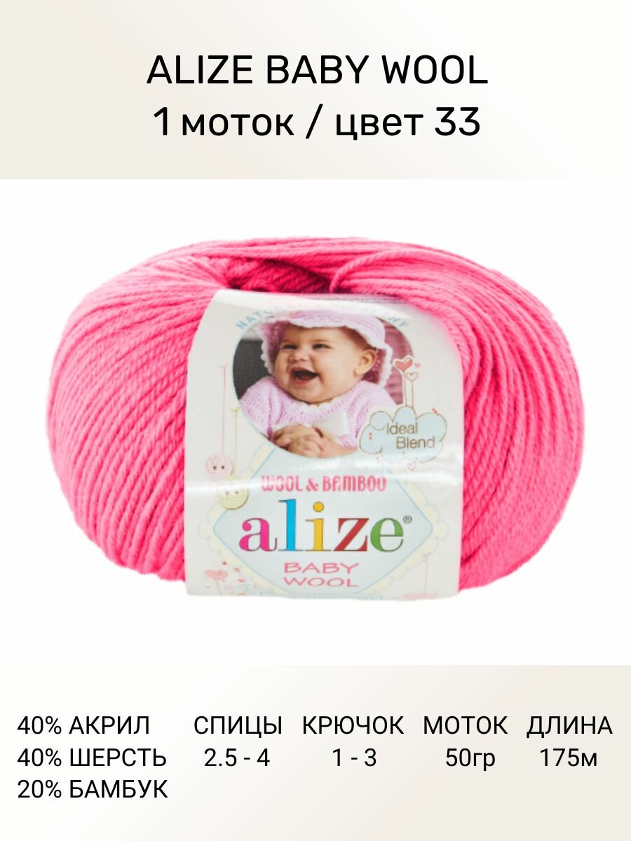 Пряжа Alize Baby Wool (Ализе Беби Вул) - 1 моток Цвет: 33, Ярко-розовый, 40% шерсть 20% бамбук 40% акрил, 50 г / 175 м