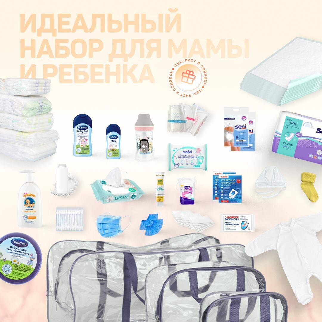 Сумка в роддом для мамы и малыша готовая с наполнением, 29 предметов + 3 сумки, комплектация "Премиум", прозрачная информация: