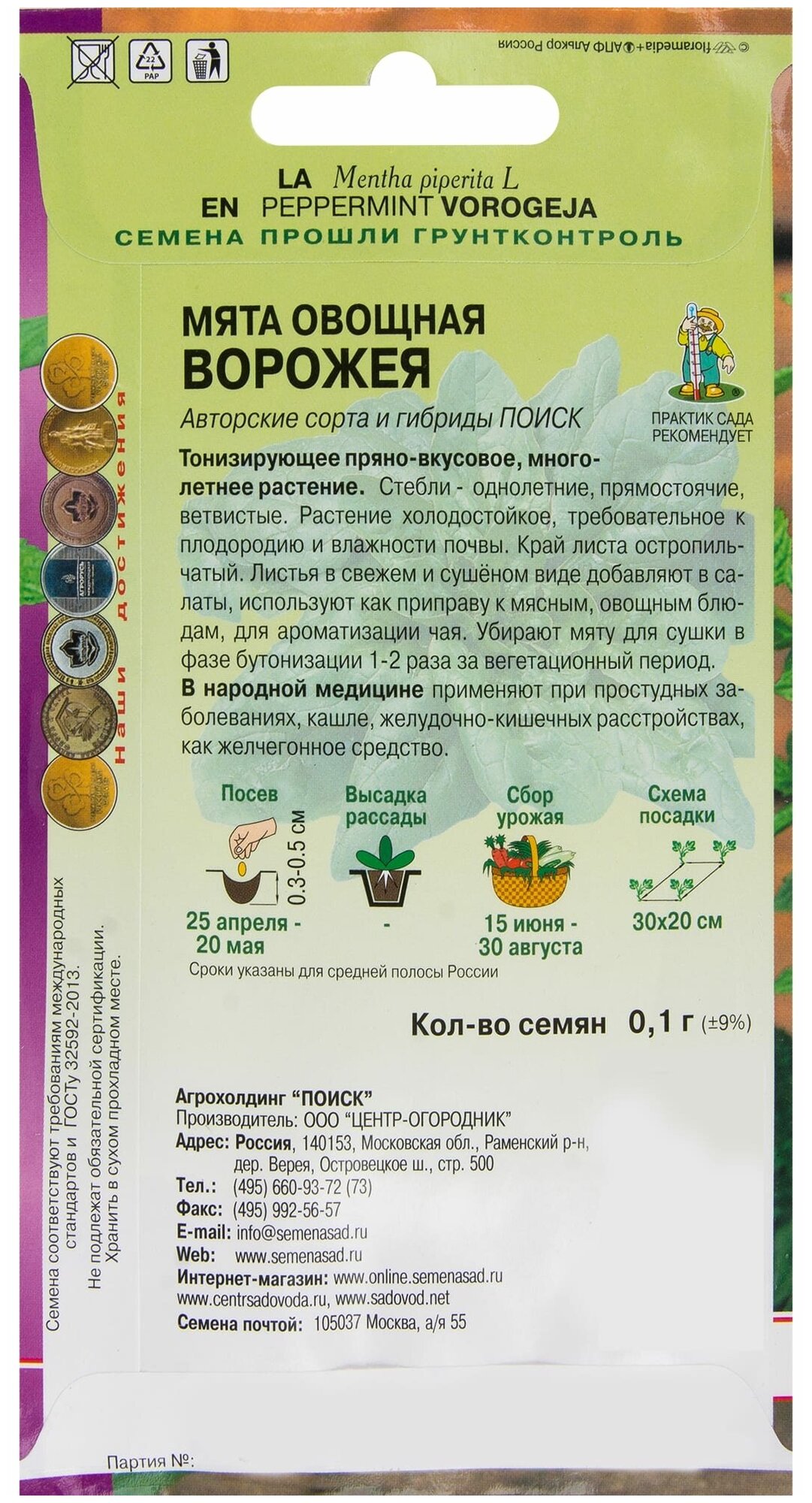 Семена Мята овощная Ворожея, 0,1 г 3 упаковки информация: