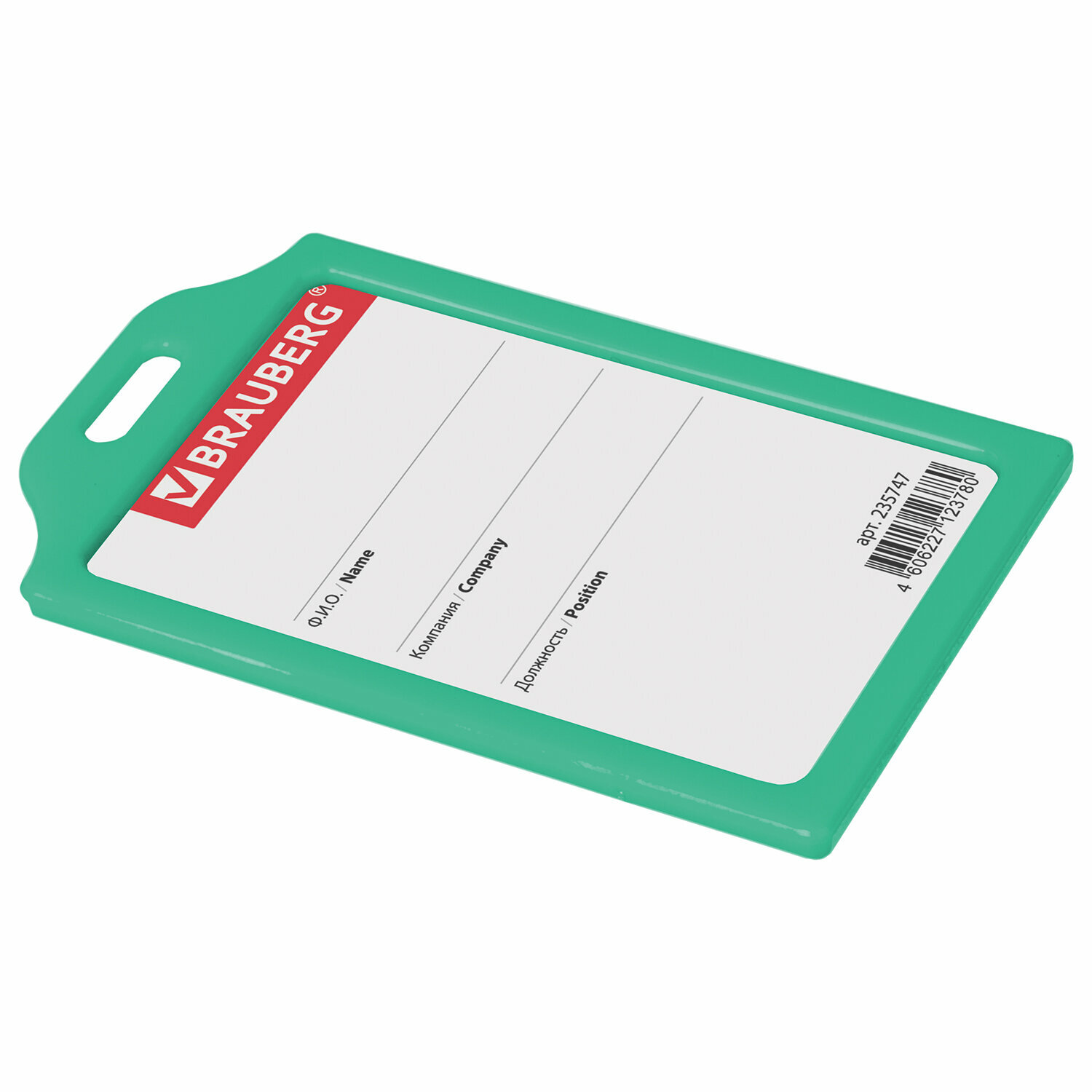 Бейдж BRAUBERG, 85х55 мм, вертикальный, жесткокаркасный, без держателя, зеленый, 235747