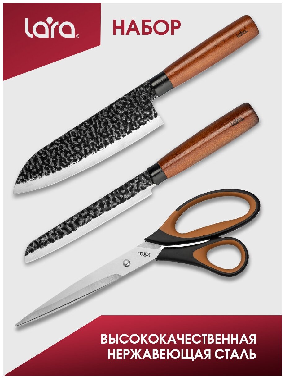 Набор ножей LARA LR05-12 Универсальный нож 17 см, Нож сантоку 17 см, Кухонные ножницы 16 см