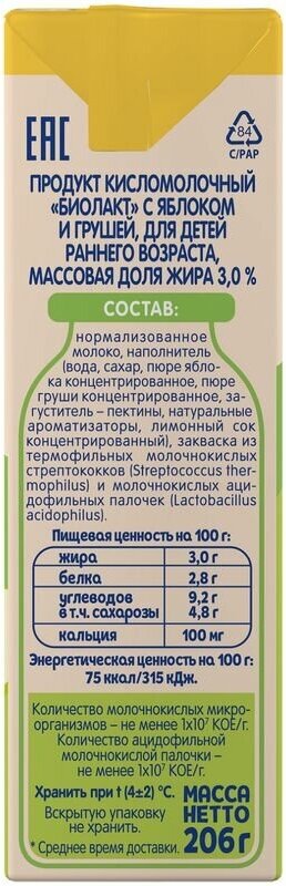 10 цен на Биолакт детский тема Яблоко, груша 3%, без змж, 206г