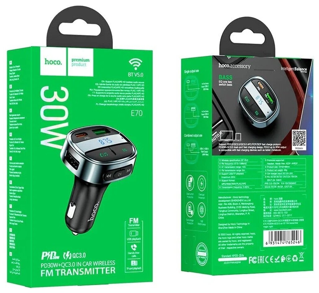 Автомобильный FM-трансмиттер Hoco E70, PD30W+QC3.0, magic night