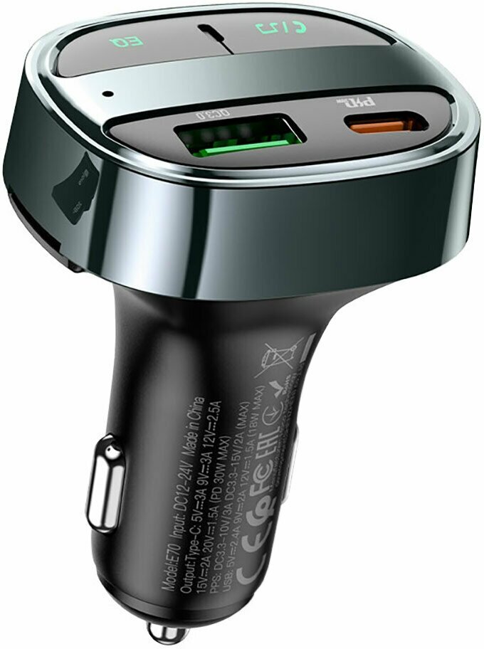 АЗУ HOCO E70 1xUSB, 1xUSB-C, 3А, PD30W, QC3.0, BT5.0, USB flash, FM, LED дисплей (черный)