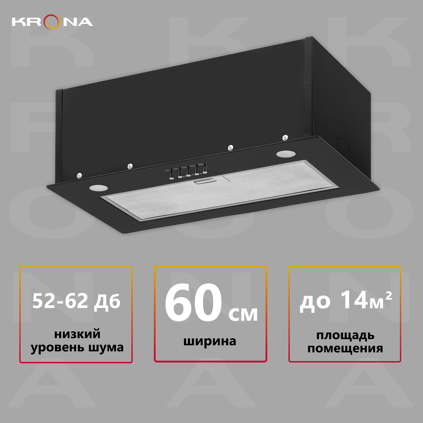 Встраиваемая вытяжка Krona KATE 600 Black PB, 3 скорости, антивозвратный клапан, 640 м3/час, чёрная