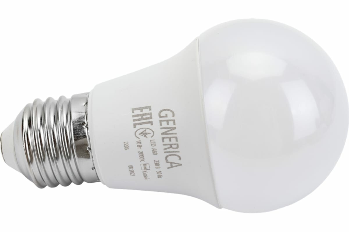 Лампочка светодиодная E27, A60 груша, 10Вт 230В 3000К, GENERICA 116 ₽