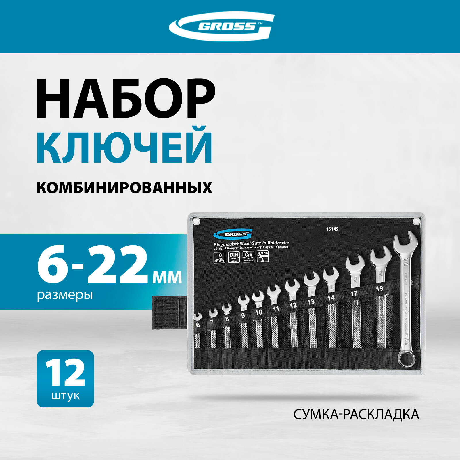 GROSS Ручной инструмент Набор ключей комбинированных 6-22 мм, 12 шт., CrV, холодный штамп 15149