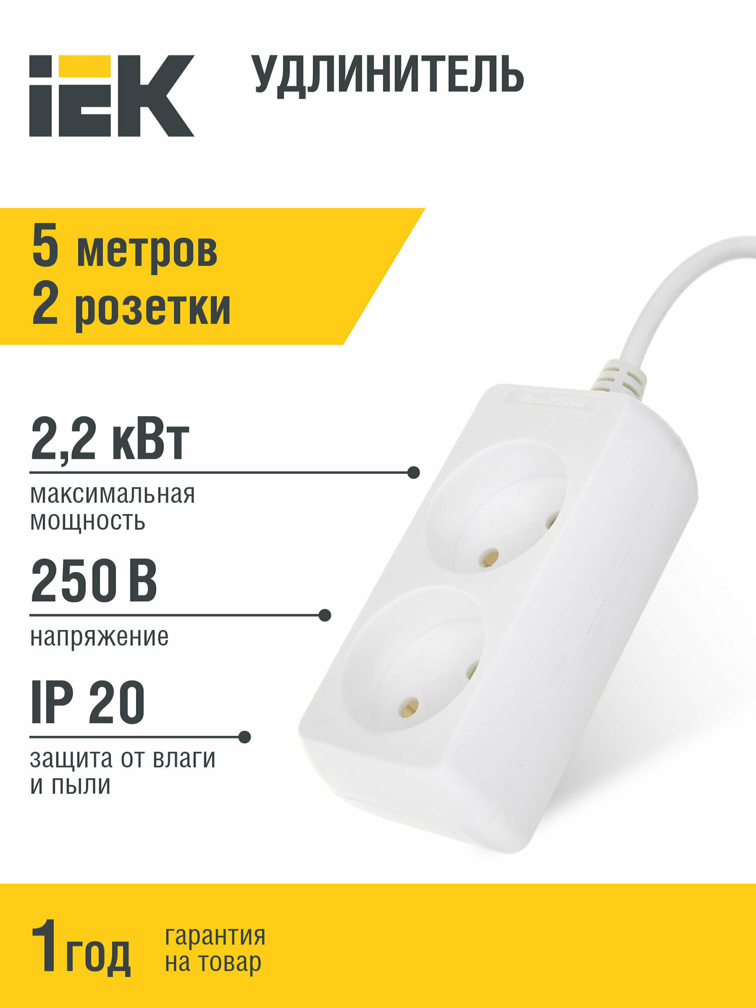 Удлинитель IEK У2, 2 x 0,75 мм², 2 розетки, без заземления, 5 м, белый