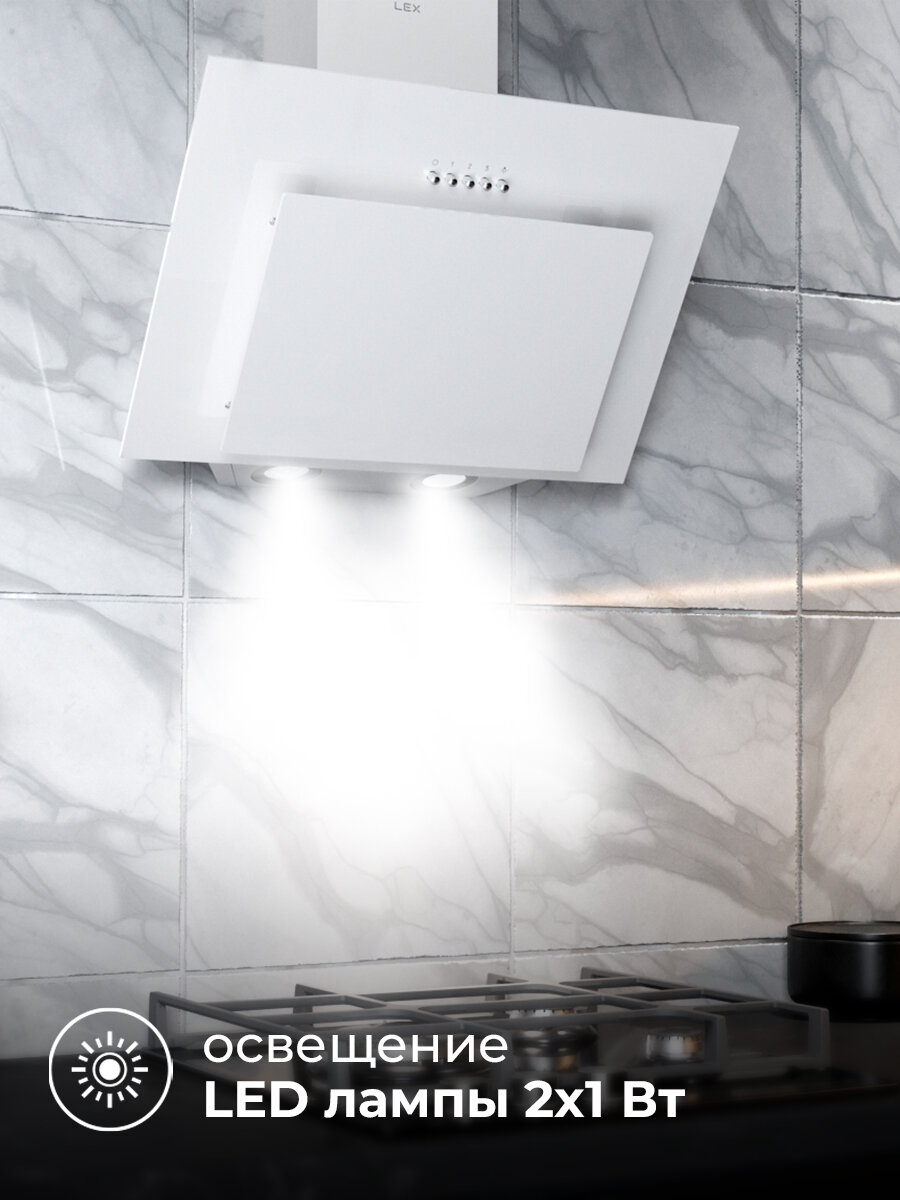 Наклонная кухонная вытяжка LEX MIO G 600 WHITE, 60 см, отделка: стекло, кнопочное управление, LED лампы, белый.