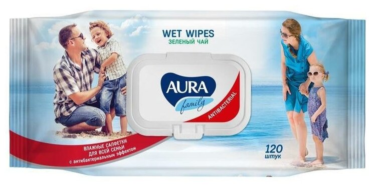 Влажные салфетки AURA FAMILY, для всей семьи, с антибактериальным эффектом, 120 шт.