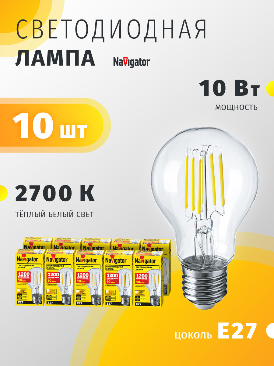10 цен на Cветодиодная лампа Navigator 80538, 10 Вт, груша Е27, теплый свет 2700К, упаковка 10 шт.
