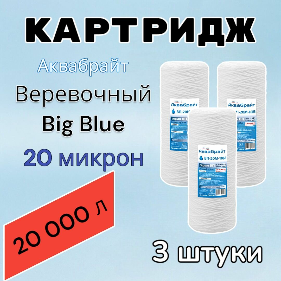 Картридж для механической очистки воды веревочный аквабрайт ВП-20М-10ББ (3 шт.), для фильтра, Big Blue 10, 20 микрон информация: