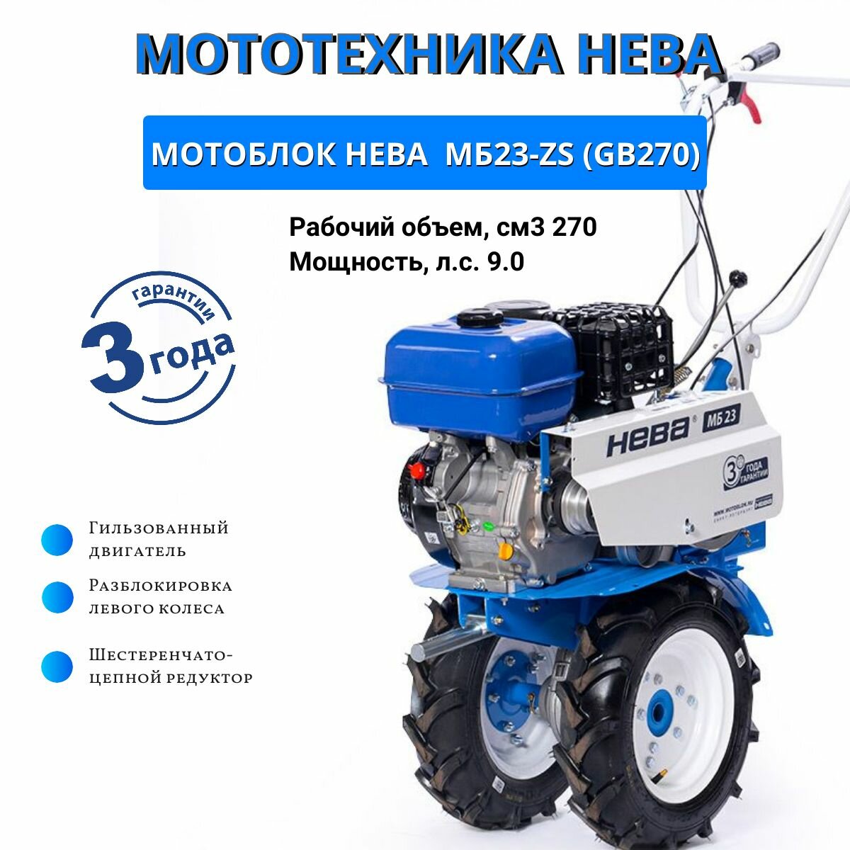 Мотоблок бензиновый нева МБ23 - ZS (GB270) (9 л.с.; Шестерёнчато-цепно)