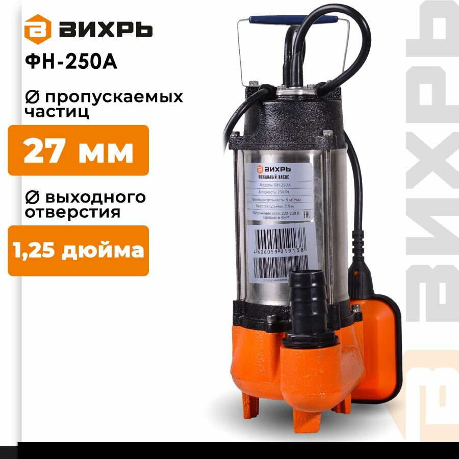 Фекальный насос вихрь "ФН-250А", 250 Вт, высота подъема – 7.5 м, 9 м³/ч, 1.25” 8 061 ₽