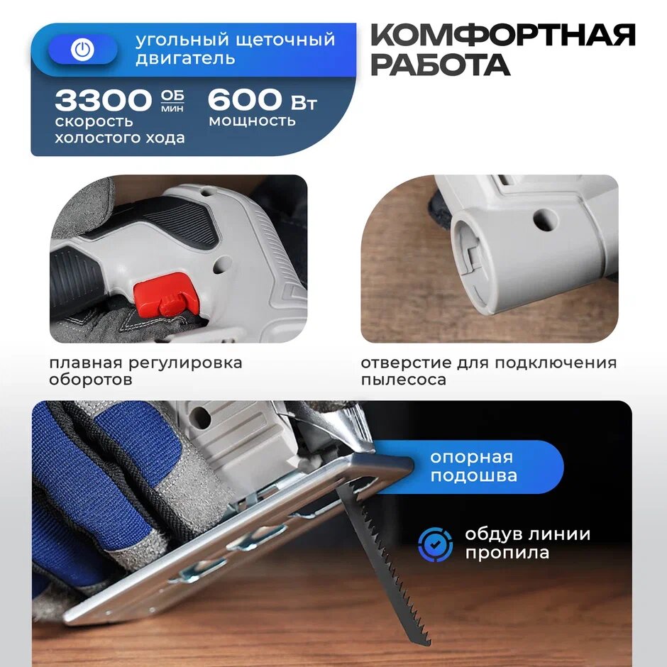 | Особенности конструкции | обрезиненная рукоятка / защитный щиток / сдув опилок / возможность подключения пылесоса |