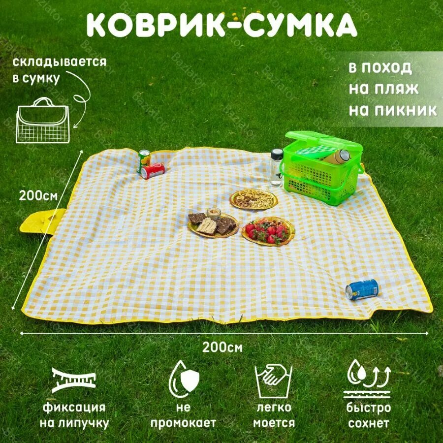 10 цен на Коврик сумка для пикника и пляжа складной 200х200 см водонепроницаемый непромокаемый влагостойкий для гальки; сумка лежак для пляжа; желтая клетка