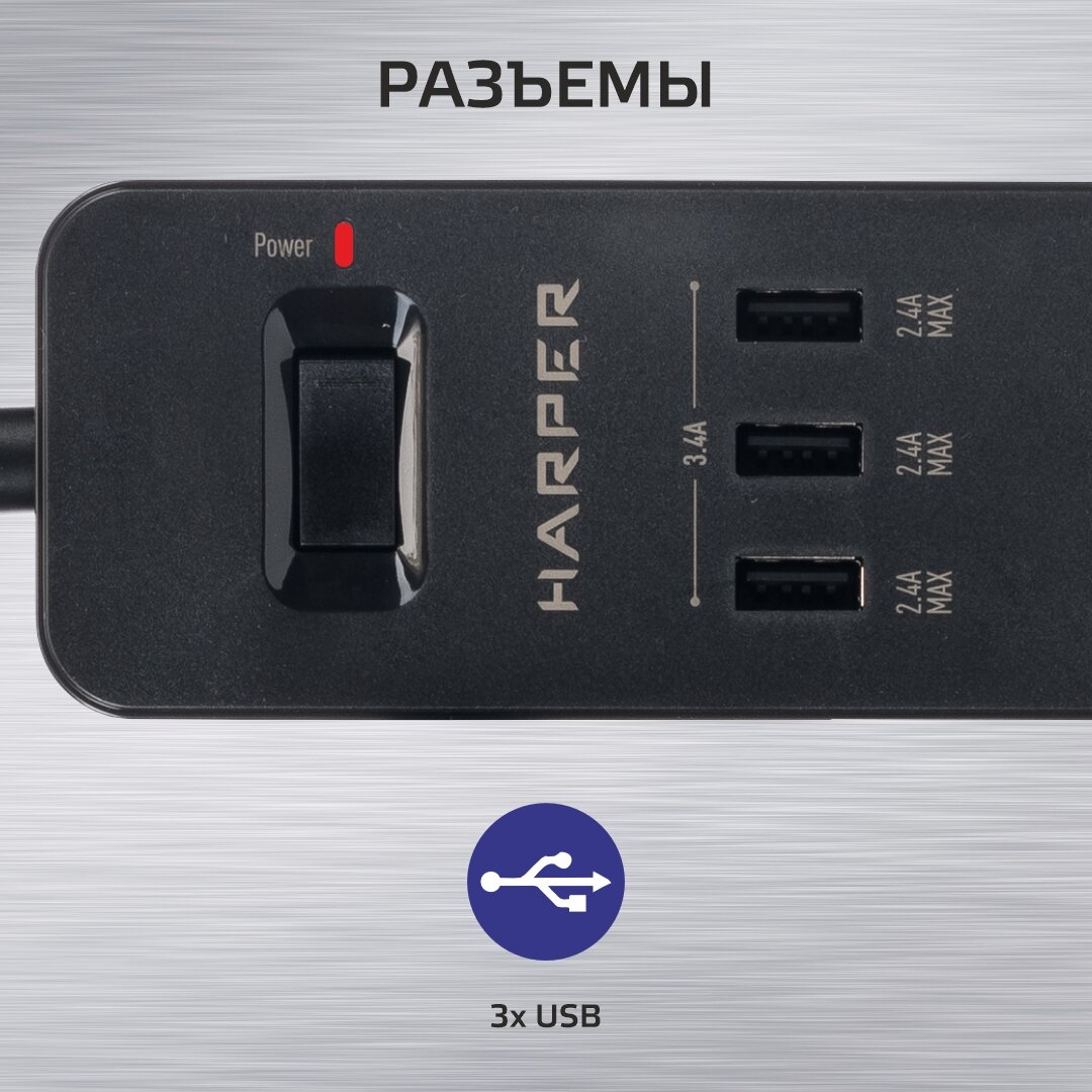Сетевой фильтр (удлинитель) с USB зарядкой HARPER UCH-325, черный 2 107 ₽