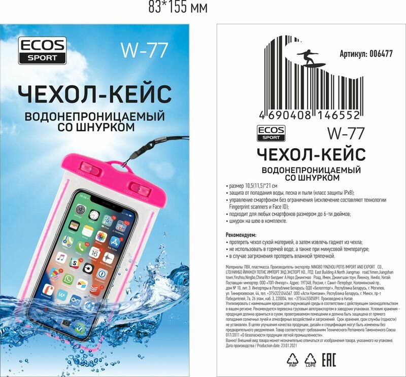 Водонепроницаемый чехол-кейс со шнурком ECOS W-77 информация: