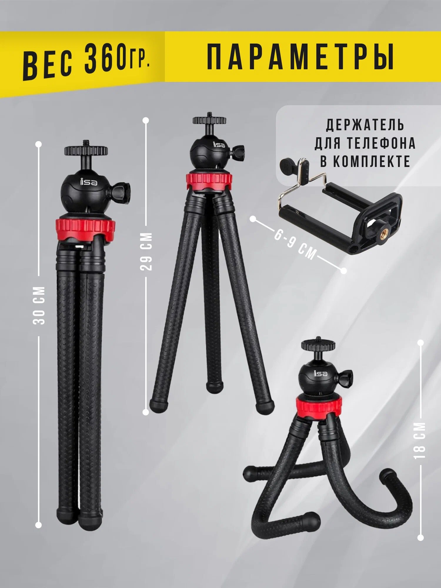 Штатив-паук ISA Octopus FLEX-25 гибкий / длина 25 см, возможность крепления на разных поверхностях, гибкая конструкция ножек, крепление 1/4", черно-белый