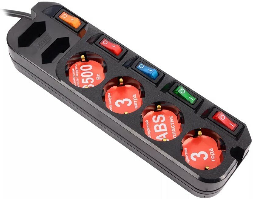 Удлинитель с индивидуальными выключателями MOST A16, 6 розеток, 3500 Вт черный 5 м