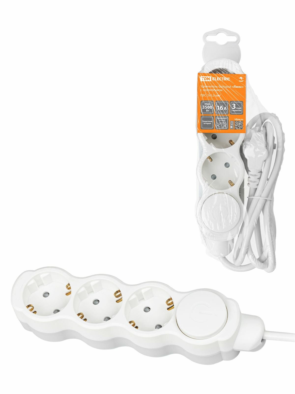 TDM SQ1303-0131 Удлинитель бытовой "Люкс" УЛ03В выкл, 3 гнезда, 3м, с з, с з ш, ПВС 3х1мм2 16А 250В бело-серый