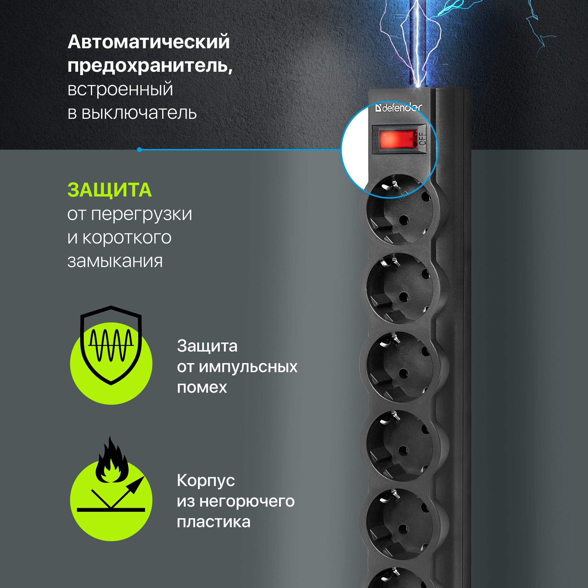 Сетевой фильтр - удлинитель Defender 6 розеток с заземлением , 5 метров , выключатель , черный 509 ₽