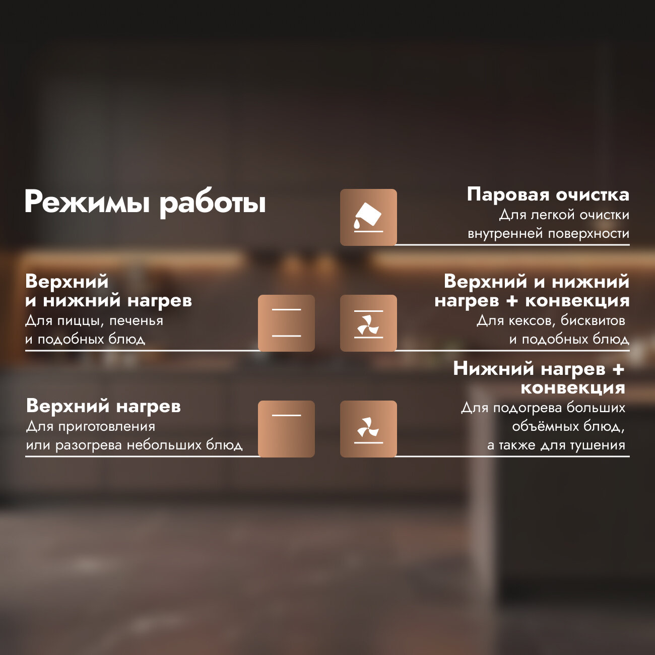 | Режимы нагрева | верхний нагрев, верхний нагрев + нижний нагрев, конвекция |