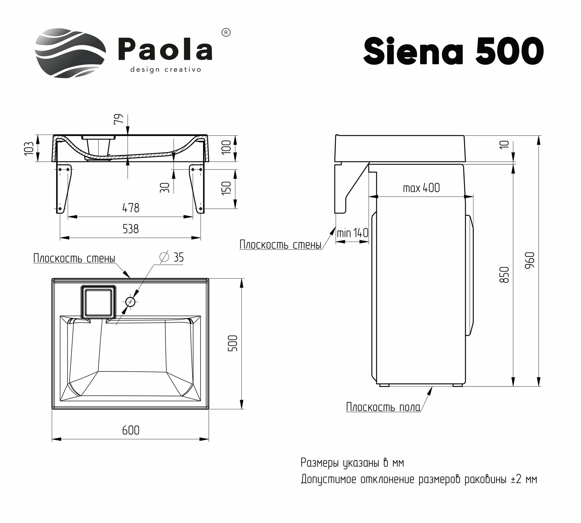 Раковина для ванной Paola Siena 600 белый 10 741 ₽