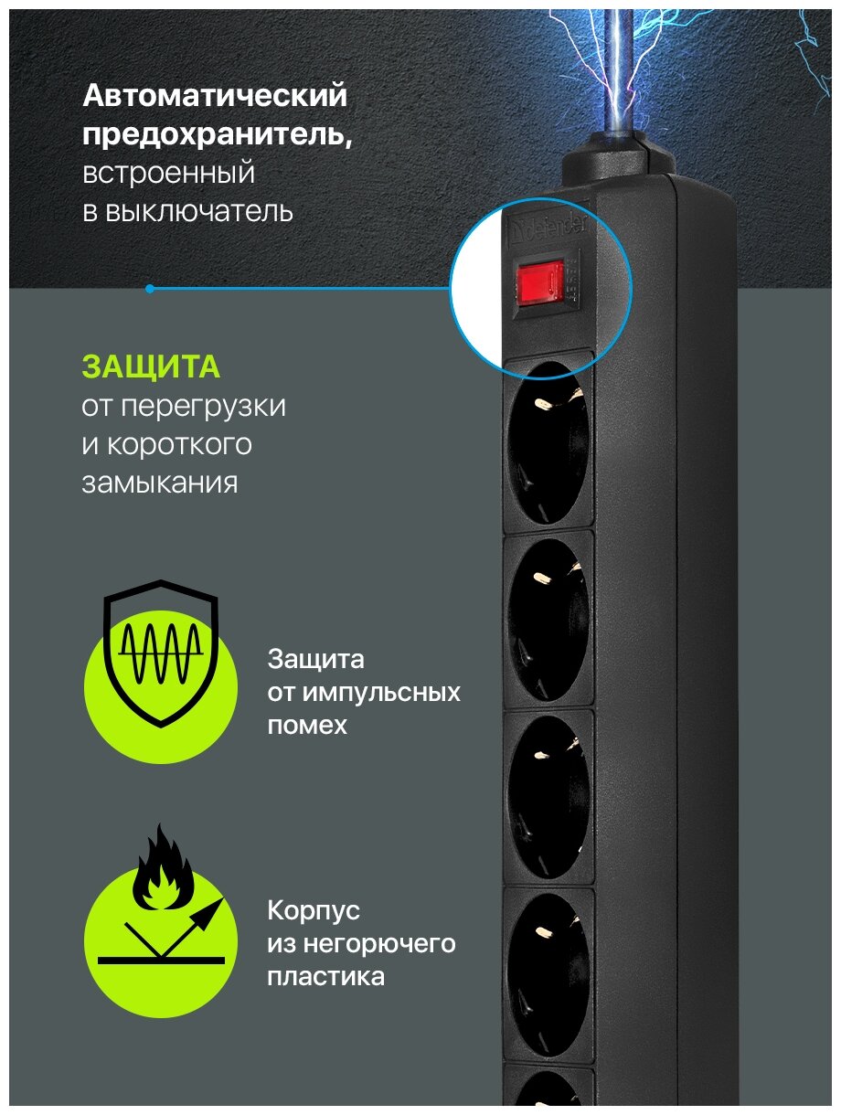 Сетевой фильтр - удлинитель Defender 5 розеток с заземлением , 1.8 метра , выключатель , черный