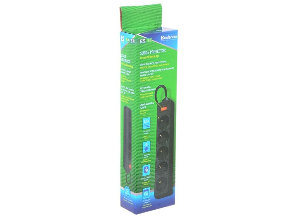 Сетевой фильтр Defender ES 1.8 (1,8 м, 5 розеток) черный