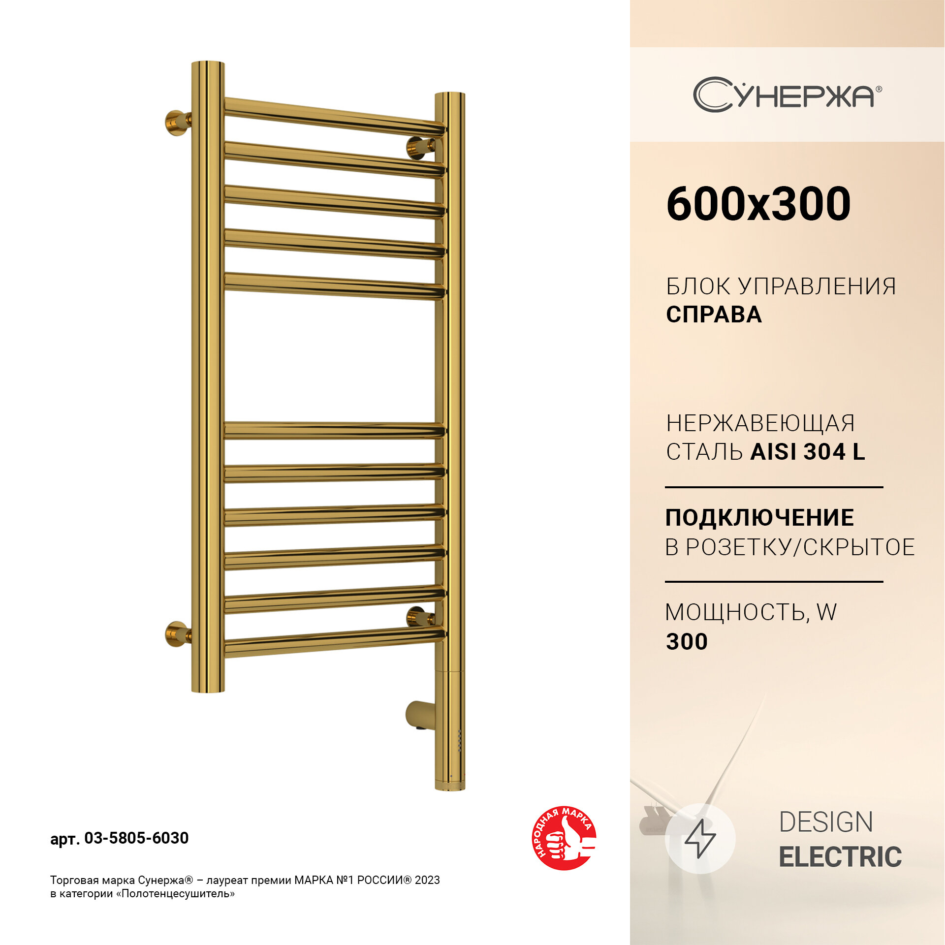 Электрический полотенцесушитель Сунержа Богема 3.0 прямая 600х300 МЭМ правый золото информация:
