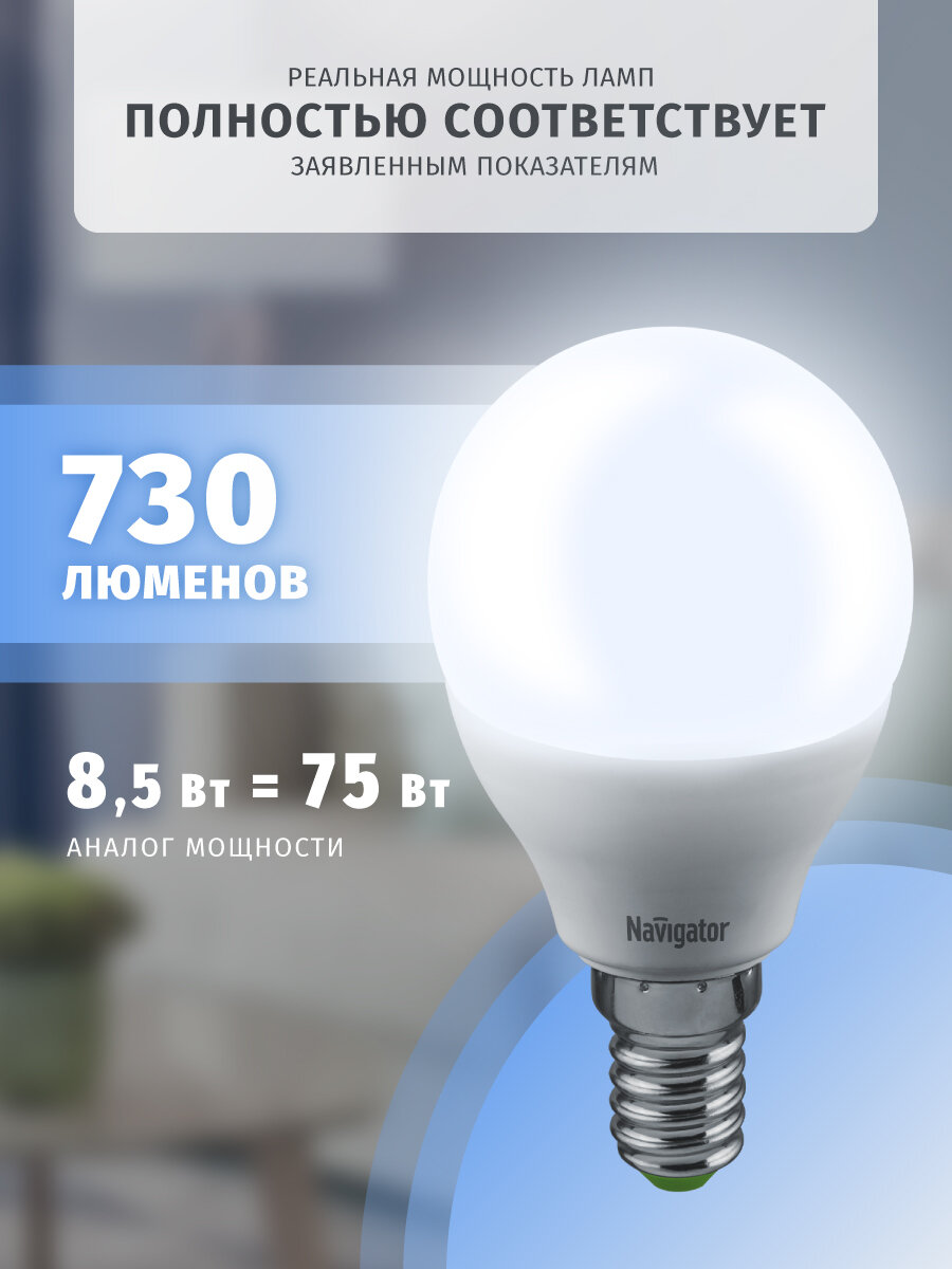 Лампа светодиодная Navigator 61 335, шар, 8.5 Вт, E14, холодный свет 6500К, упаковка 10 шт. информация: