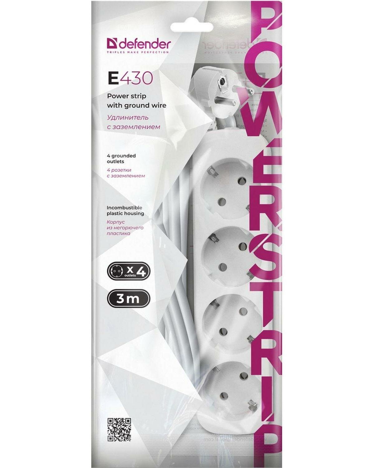 Удлинитель Defender E430, 4 розетки, с заземлением, 3м, белый